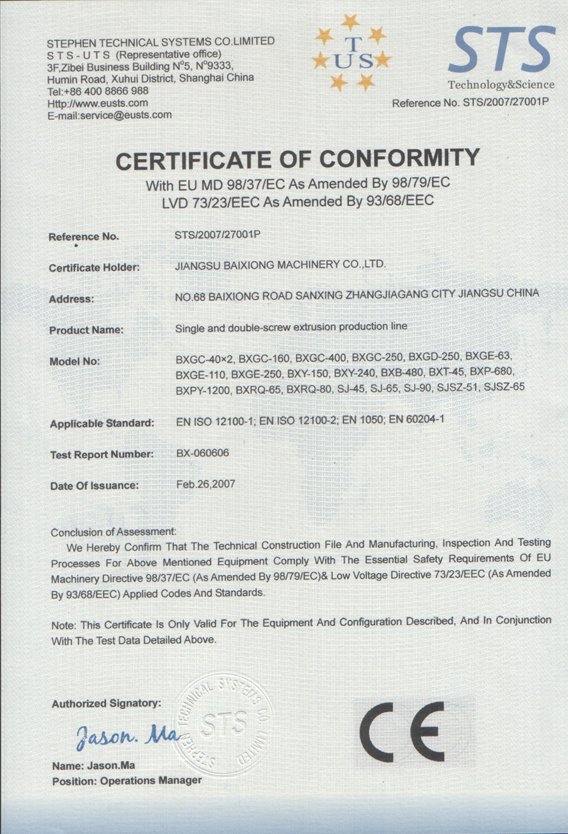 CE certificate for extruder